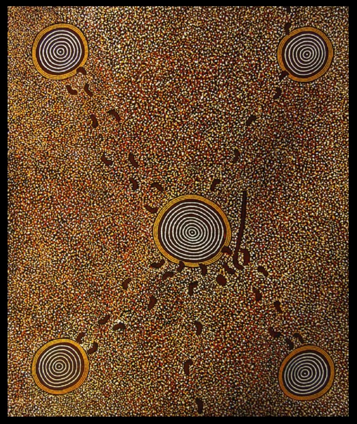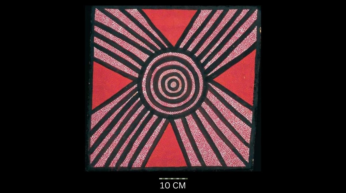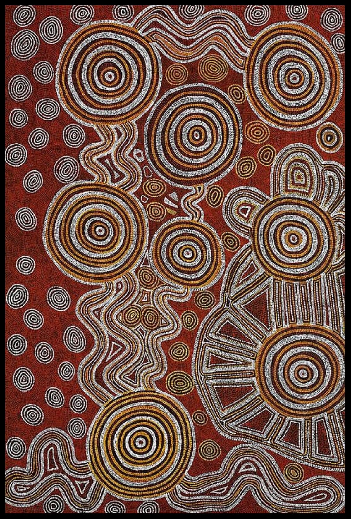 Anatjari drew not only from central desert iconography but from iconography found on dance boards and churinga from his homelands further West. The sacred boards of these areas have concentric squares and were often depicted