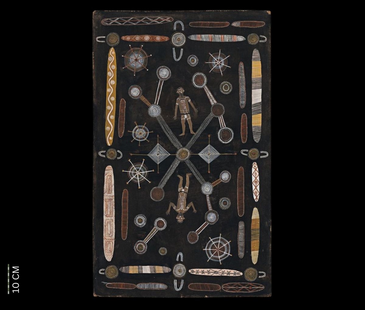Synthetic polymer powder paint on particle board, bears title (Old Man Corroboree) and the words ‘Four Bullroarers, Central cave’ in Peter Fannin’s hand on the reverse,