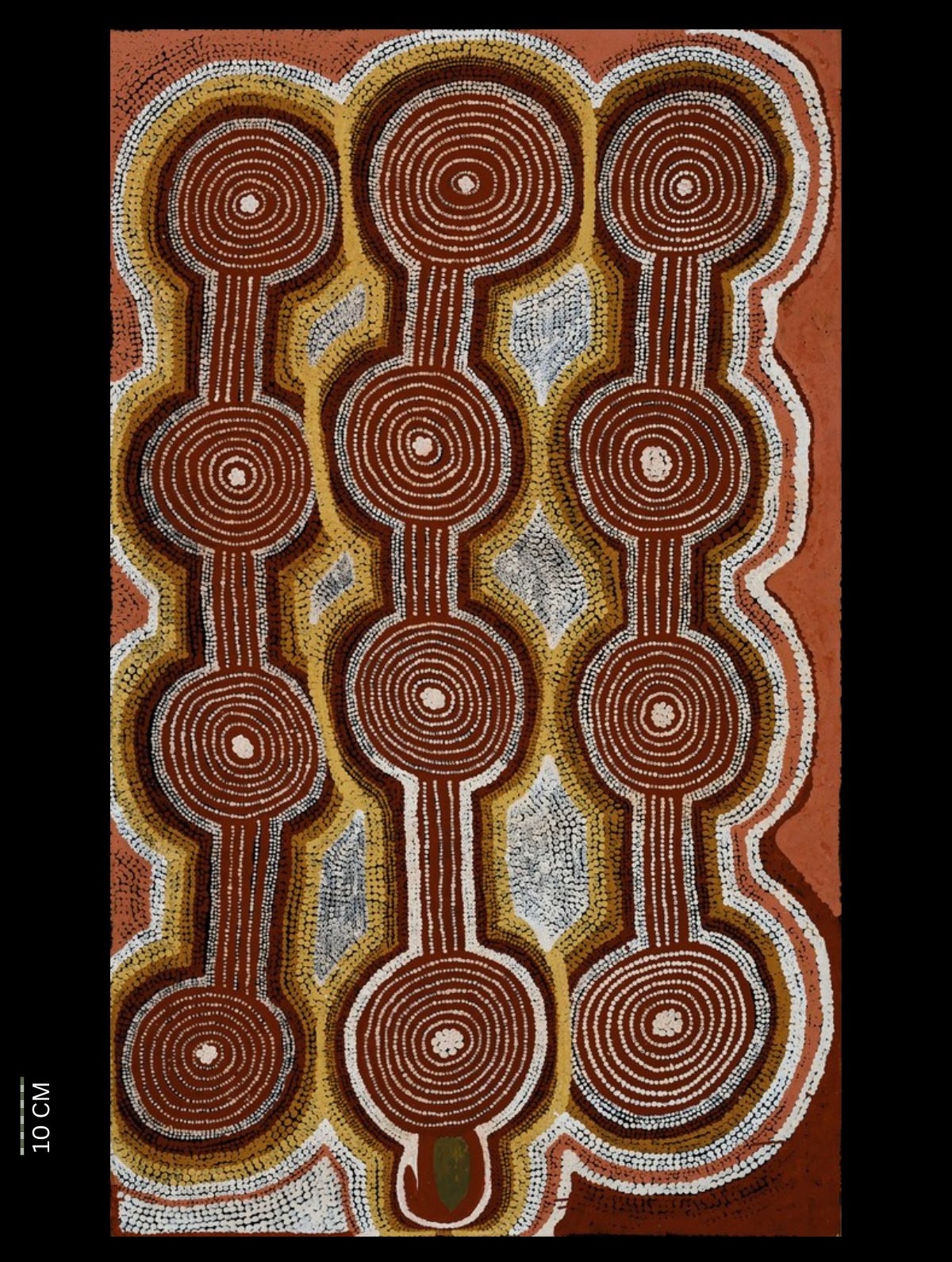 The trial is a visual depiction of a mythological story of a punishing spirit, here represented by a circular figure that is confined by surrounding shapes into a dark center. The use of white dots in the painting is interpreted as combining reference to the “frost” identified with the ancestral being at this place but also drawing on usages of white material in ceremonial body decoration