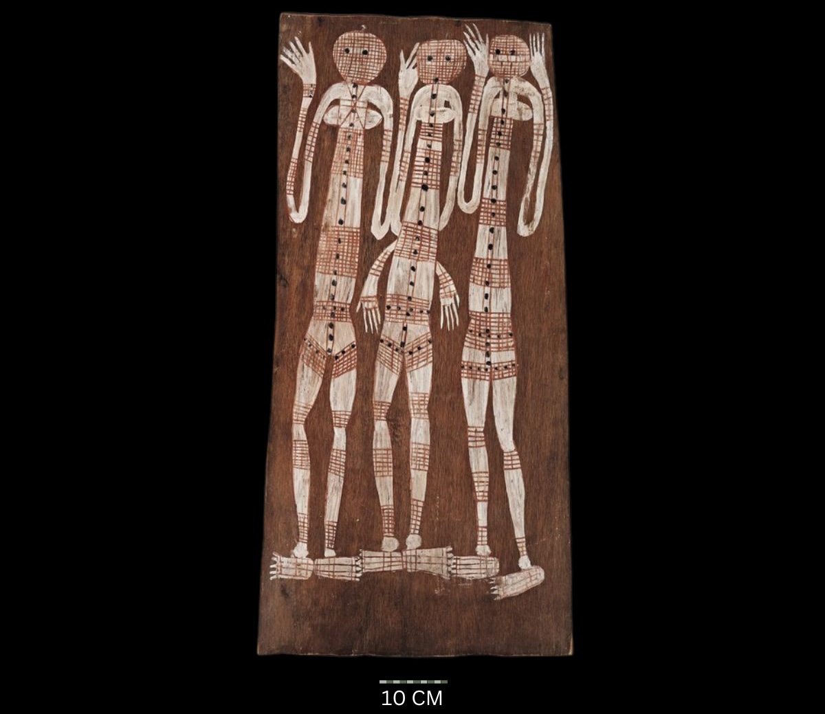 Natural earth pigments on eucalyptus bark, bears artist’s name in biro together with the artist’s name, title, language group (Djawaitja), date and place of execution (1958, Croker Island N. T.) and brief notes relating to the story depicted on label on the reverse,