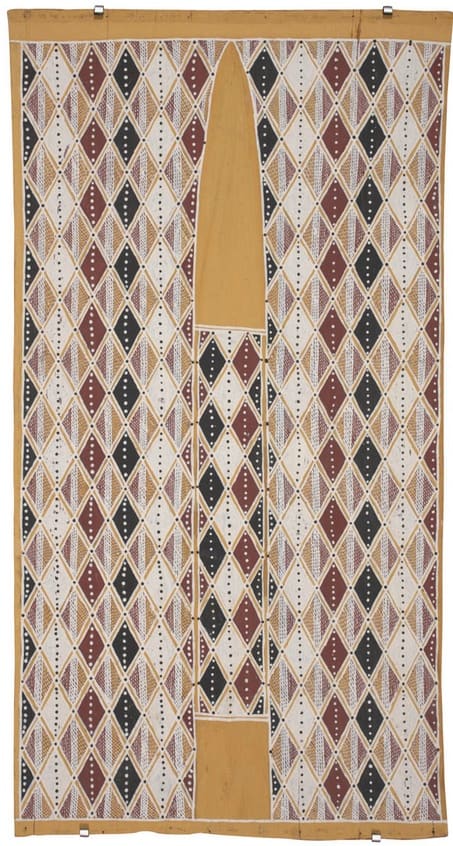 Wuvulus traditional totems are Niwuda (honey), Djalumbu (hollow log), and Eel-Tailed Catfish. The honey men’s design is diamonds and a Djalumbu is a hollow log bone receptacle used for burial. One of these three totems is usually on jimmy’s artworks. He also paints Turtle Fish possum birds flying fox lizards and snakes. His early barks were naturalistic images of turtles and other animals. Like Millpurrurru and Bulunbulun a single totem animal was often repeated numerous times. He also painted depictions of the hollow log bone receptacles. These often have a distinctive black dot eye and other sacred objects. Due to their commercial success and more senior customary position, Jimmy stopped painting animals. He started focusing on painting sacred objects and the catfish totem often in a repetitive and symmetrical fashion.