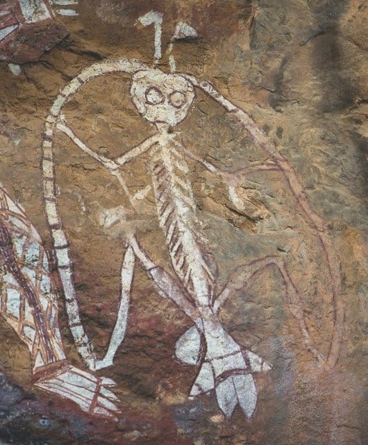 Namarrkon is the lightning spirit, the source of the fierce tropical storms in Western Arnhem Land during the wet season. During the dry season, he lives in a billabong not far from Numbuwah, a sacred rock in Western Arnhem Land. Namarrkon’s dreaming site (djadjan) is a slight projection in the outline of the Arnhem Land escarpment. It consists of three fused pillars, one with a circular hole near the top. This is a few km NE of the Nourlangie Rock tourist site to the east of Koongarra saddle. Namarggon left one eye (the hole) to watch for the monsoon, but also to watch his estranged wife, whose home is a cave in a pillar near Koongarra. Namarrkondjadjan is well-named, as the promontory creates the earliest intense lightning storms.